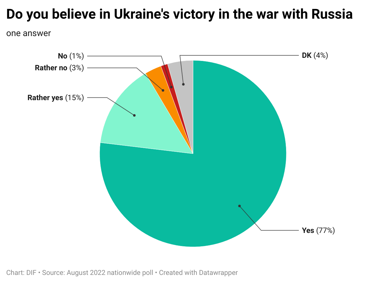 Ukrainians are strongly confident they can win the war. Please, pay attention this poll was conducted in early August, before Kharkiv offensive, liberation of Lyman and Kherson. In the time when many doubted in the West Ukrainians can advance, for many it was a real eye opener.