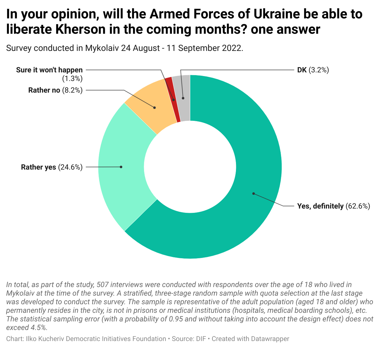This claim is supported by our survey in the city of Mykolaiv, which was shelled every day since 1 March till 12 November. Nonetheless, when we poll residents in August and September, we found out that people believed in liberation of Kherson very soon. It means that when Russians started their brutal campaign of destruction of critical infrastructure Ukrainians became even more determined to fight until this threat is removed completely.