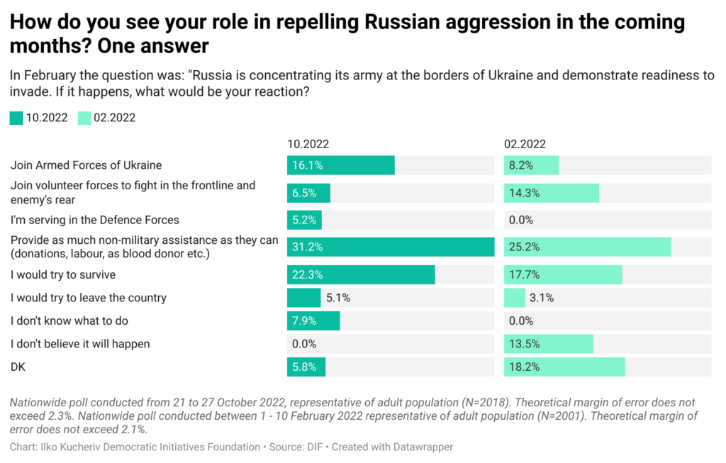In February 2022, just ten days before the invasion 46% Ukrainians have been ready to fight.