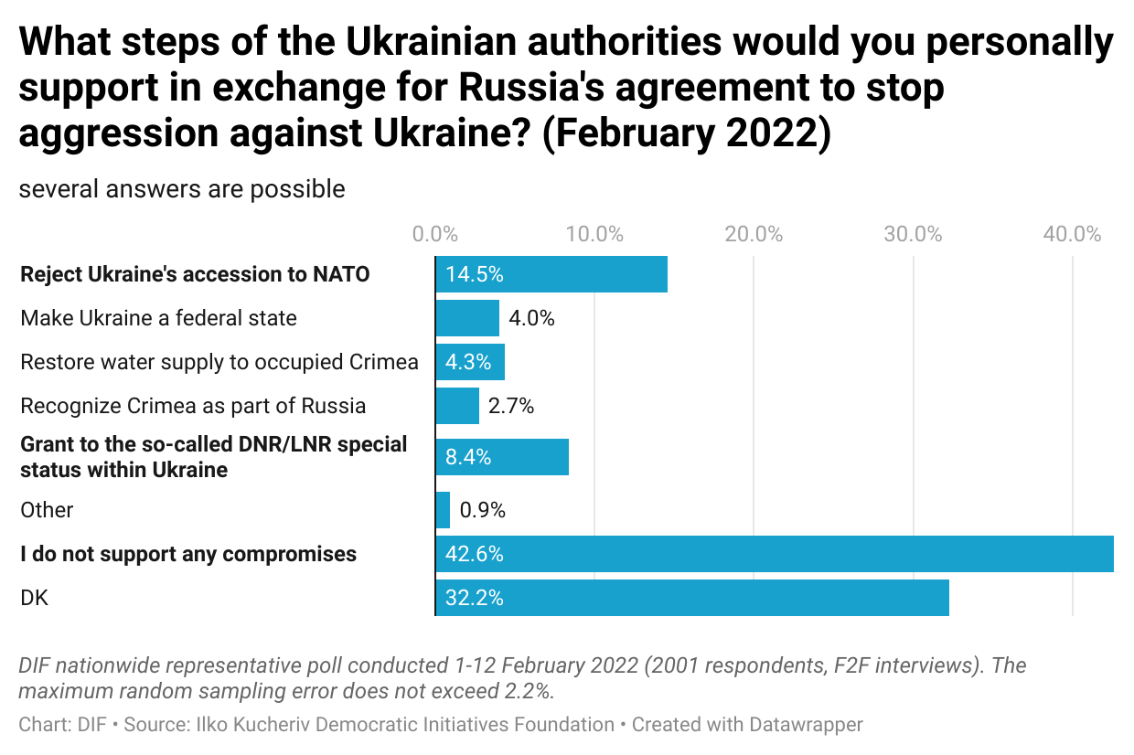 We were not ready to refuse joining NATO, cede Crimea to Russisa or grant special status to Russian occupied Donbas. Since 2014 Ukrainian opinion polls showed that people have decided to resist any attempts to bring them under Russian clout.