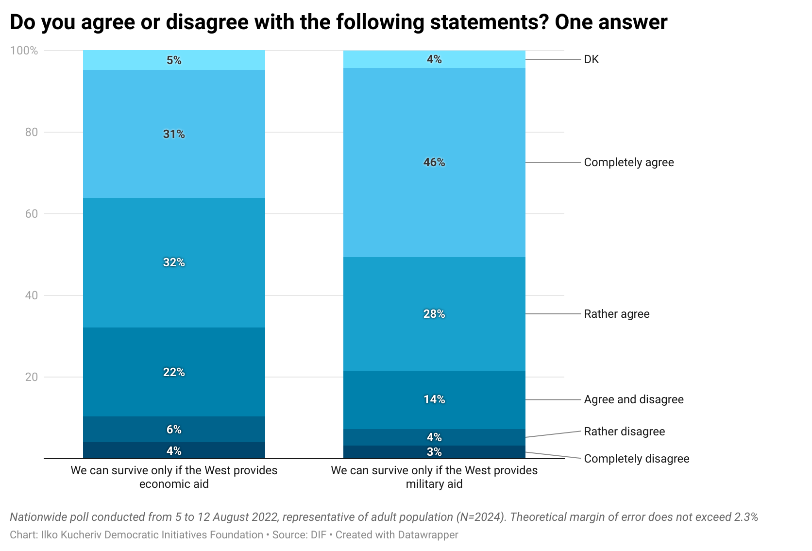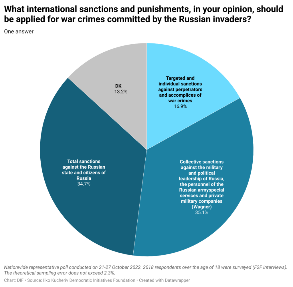 In a nutshell, despite all Russian attempts to terrify the Ukrainian society and coerce it into complete or partial subjugation, Ukrainians responded with unprecedented consolidation and readiness to fight against aggressors. This fact must be remembered and taken into account by the key decision makers in EU and US. These results explain that the best way to achieve sustainable and lasting peace is to provide Ukraine with sufficient military, economic and humanitarian aid to defeat Putin’s Russia.