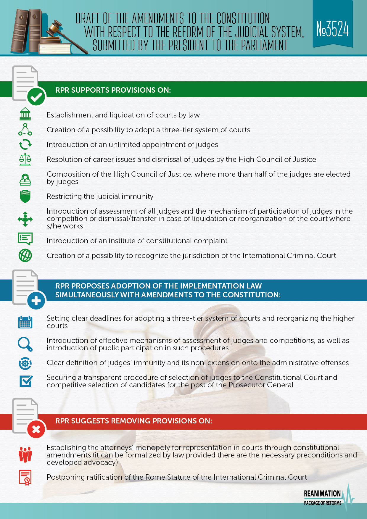 “In general Amendments correspond with the opinion of the Venice Commission”, Mykhailo Zhernakov said. “It lays ground for the establishment of the independent and responsible judiciary for years to come”. However, the expert points out that the core issue of a judicial reform is the renewal of the judiciary which the constitutional amendments alone do not provide. Therefore, the implementation law stipulating the creation of the new courts and the procedure of transparent competitive based appointment of judges in these courts has to be voted together with the amendments. Integrity, impeccable reputation and proficiency should be the key characteristics of the new judges. “The integrity check is a crucial point. The reload of the judiciary can only be successful if civil society has a dominant role in this process, because the people should trust their judges. RPR experts are now working on this procedure, and we see enough political will among the key decision-makers to make it part of the legislation. However, if such law is not voted together with the constitutional amendments, the reform will not achieve the desired result.”
