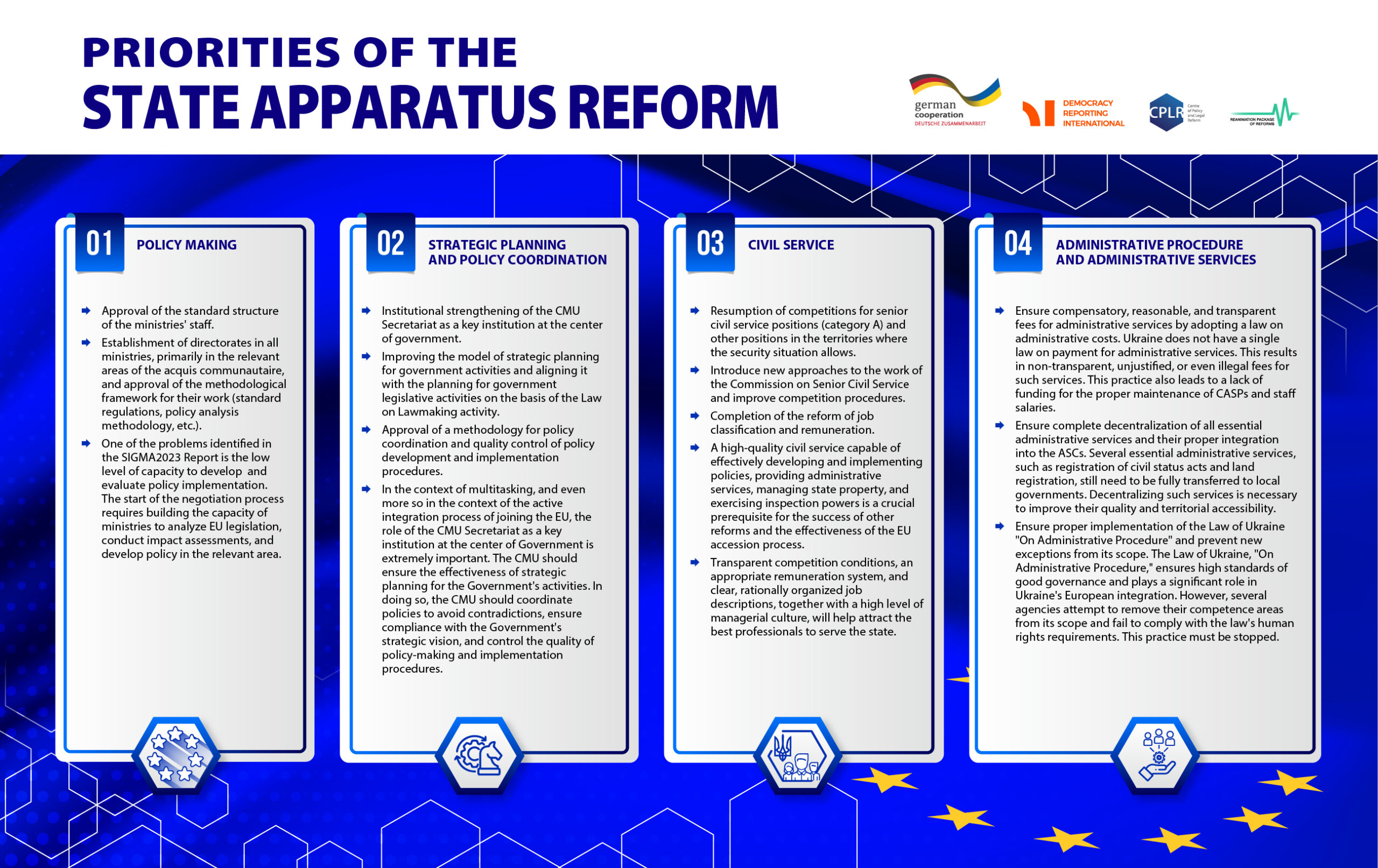 Chairman of the Board of the Center of Policy and Legal Reform Ihor Koliushko summarized: “The efficiency of public administration organization is one of the key factors for joining the EU. If we are not able to create an effective public administration, it is better not to join the EU, because we will not feel comfortable there.”