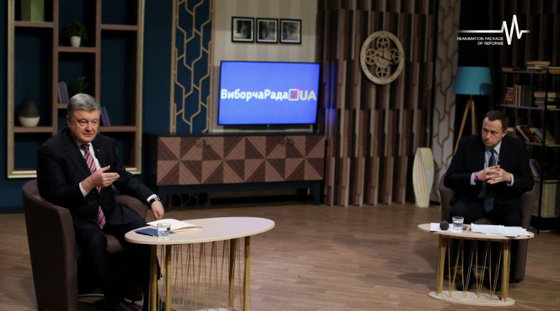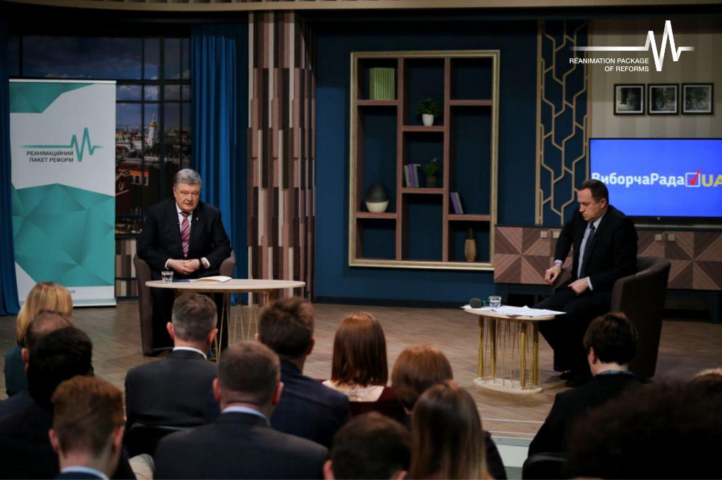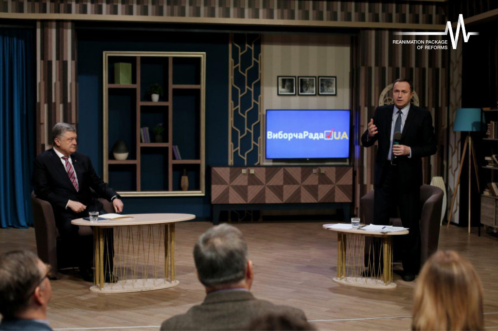On April 17, experts of the non-partisan initiative Election Council UA (Vyborcha Rada UA) and the Reanimation Package of Reforms Coalition held a public discussion with a candidate for the President of Ukraine Petro Poroshenko at the public broadcasting company. Both winners of the first round of the presidential election were invited to the discussion, but Volodymyr Zelenskyi declined the invitation of the experts.