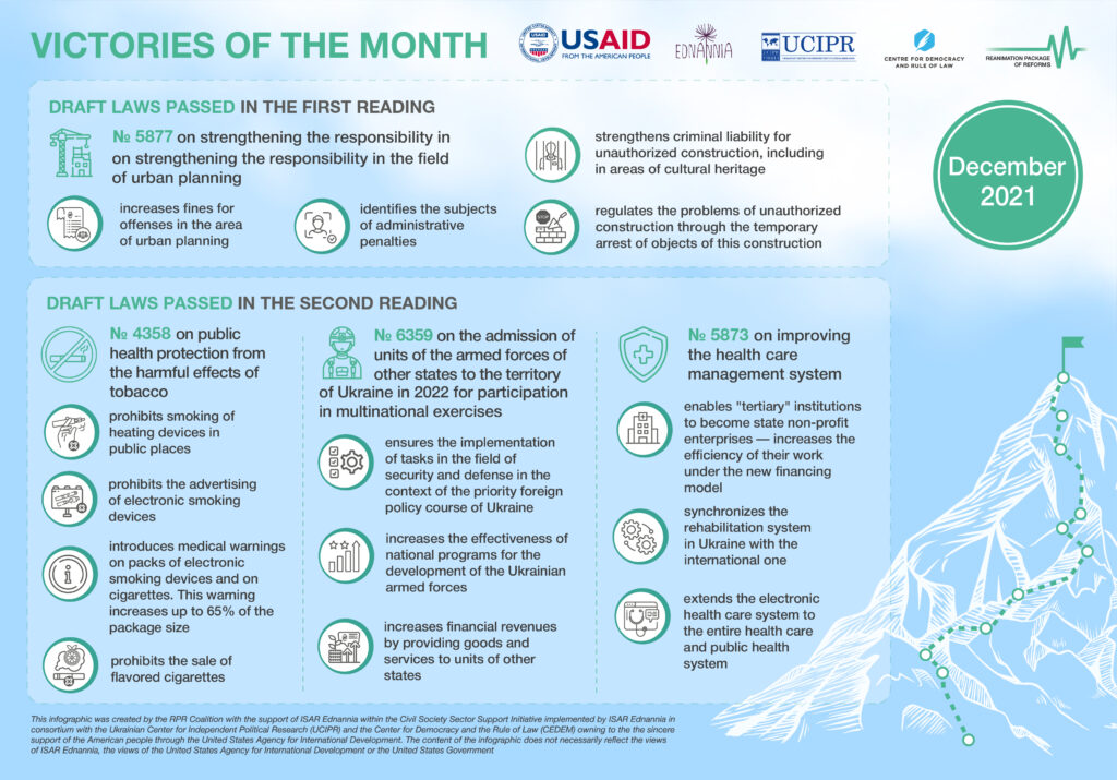 In December 2021, the Verkhovna Rada equated electronic smoking devices with regular cigarettes and banned their advertising. The Ukrainian parliament also continued health care reform and began fighting property developers. All the details about the laws-victories in our monthly infographic: