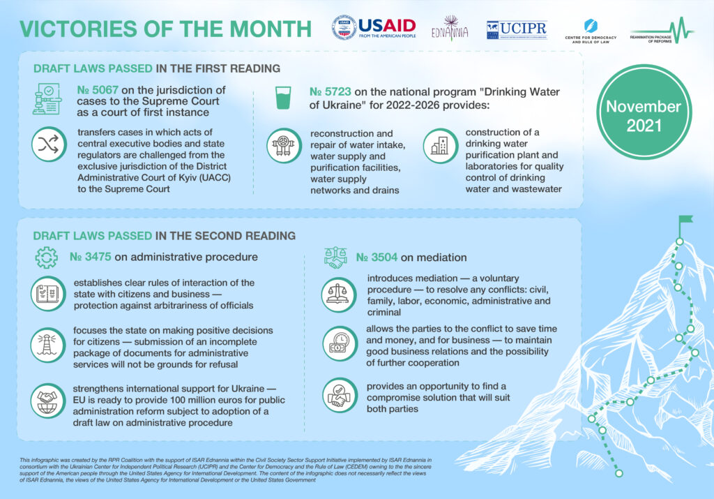 In November 2021, the Verkhovna Rada finally passed a draft law on administrative procedure in the second reading, which was delayed for more than 20 years. In the first reading, the Parliament also adopted a draft law that “takes away” from the notorious Kyiv District Administrative Court cases in which acts of central executive bodies are challenged. More interesting things — in our infographics.