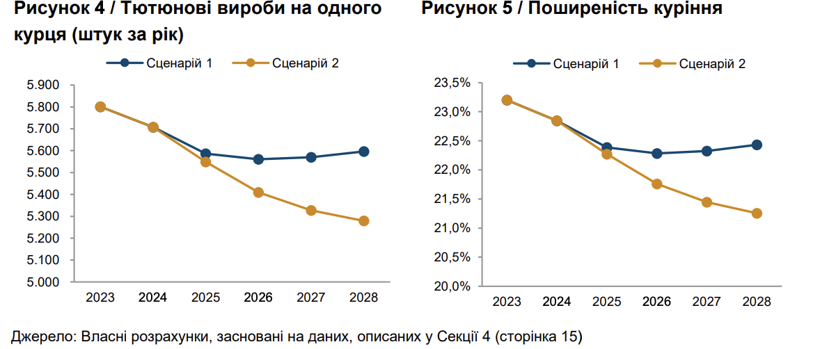 Якщо ж рівномірно збільшити акциз до 120 євро/1000 шт., поширеність епідемії вживання тютюну стабільно падатиме, і до 2028 року знизиться на 8,4%.