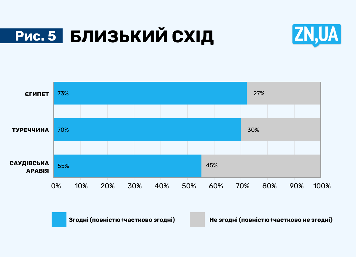 Найскладніша для України ситуація зараз на Близькому Сході. Опитування показує громадську думку станом на серпень цього року, до терористичної атаки ХАМАС і обстрілів Гази Силами оборони Ізраїлю. Україна зайняла позицію рішучого засудження ХАМАС. Дещо пізніше до цього додалася теза про необхідність враховувати право палестинського народу на свою державу. Тому вже зараз можна передбачити, що принципова підтримка антитерористичної операції Ізраїлю знизить підтримку України на Близькому Сході. Хоча не варто виключати й того, що зближення України та Ізраїлю принесе вагоміші результати для сфери оборони, ніж постійне дипломатичне маневрування між близькосхідними автократами.