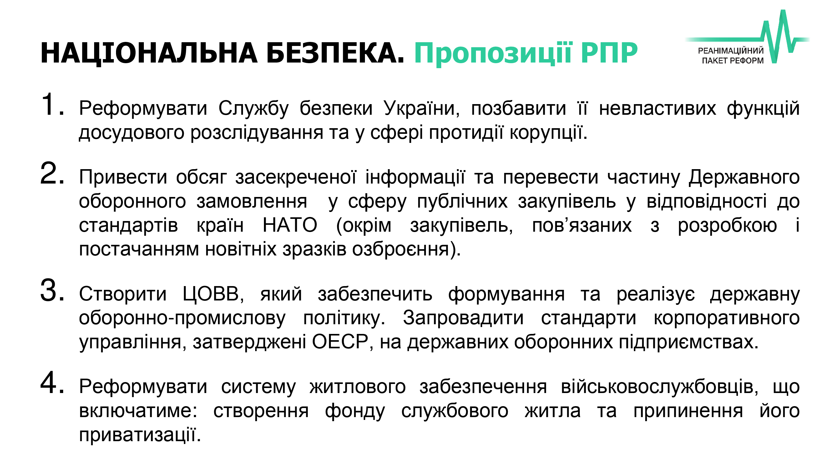 Представники всіх кандидатів заявили про свою підтримку курсу України на вступ до НАТО. Щодо ключових пріоритетів РПР, Віктор Галасюк зазначив, що кандидат у президенти Олег Ляшко виступає за створення ЦОВВ для формування та реалізації державної оборонної політики, а також переведення частини Державного оборонного замовлення у сферу публічних закупівель.