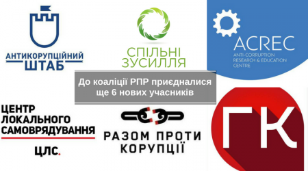 До платформи Реанімаційний Пакет Реформ приєдналися шість нових громадських організацій: ГО “Разом проти корупції”, ГО “Центр локального самоврядуваня”, Міждисциплінарний науково-освітній центр щодо протидії корупції в Україні (ACREC), ГО “Антикорупційний штаб”, ГО “Агенція питань стратегічного розвитку та комунікацій “Спільні зусилля”, ГО “Платформа Громадський Контроль”.