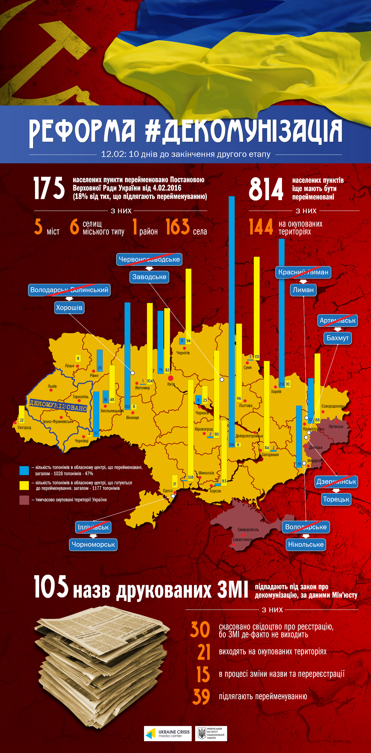 За десять днів до завершення другого етапу декомунізації Український інститут національної пам’яті спільно з Українським кризовим медіа-центром піготували інфографіку про стан реалізації реформи.