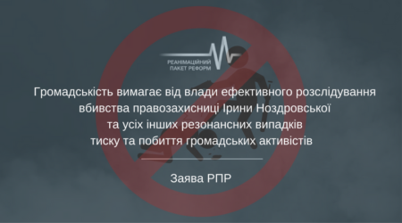 Громадськість переконана: беззуба і корупційна правоохоронна та судова система, відсутність покарання за тиск, побиття та вбивство громадських активістів розв’язує руки криміналітету, бізнесу та корумпованій місцевій владі для ще більш жорстокої боротьби проти активістів, викривачів та правозахисників. Саме тому Реанімаційний Пакет Реформ закликає: