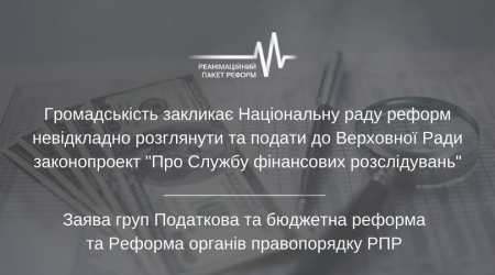Експерти групи Податкова та бюджетна реформа та групи Реформа органів правопорядку Реанімаційного Пакету Реформ наголошують: створення незалежної, доброчесної та ефективної Служби фінансових розслідувань було публічно підтримане Президентом України та Урядом, це є невід’ємною частиною реформи ДФС та однією з ключових вимог МВФ.