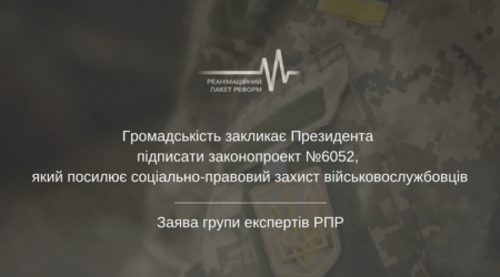 Враховуючи вищезазначене, експерти групи Національна безпека і оборона коаліції громадських організацій Реанімаційний пакет реформ закликають Президента України Петра Порошенка невідкладно підписати законопроект №6052, який вирішує актуальні питання соціально-правового захисту військовослужбовців.