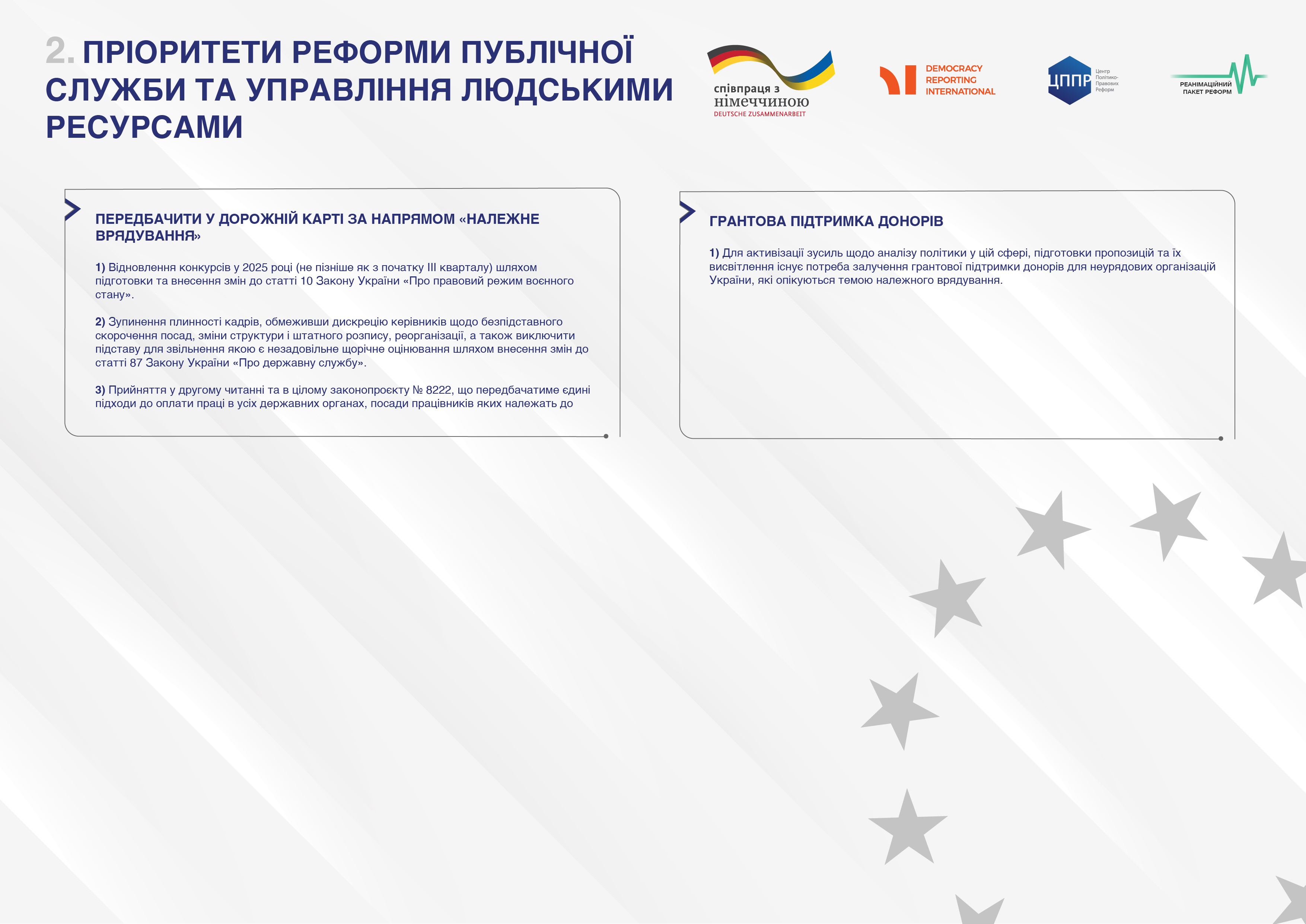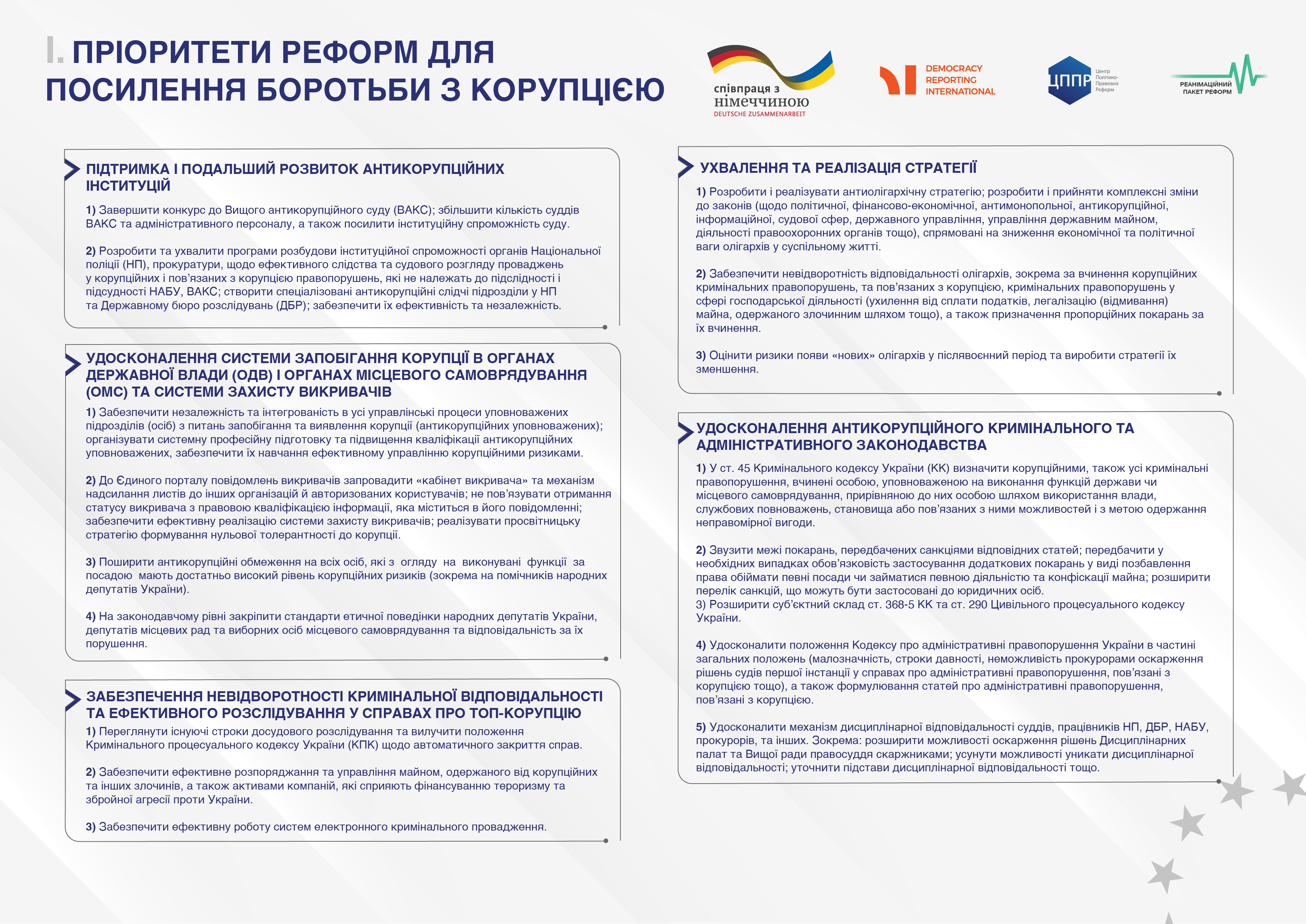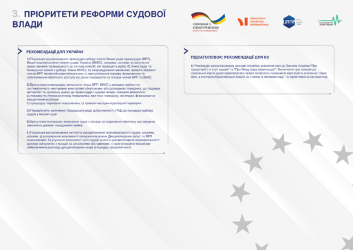 На публічній дискусії «Ключові пріоритети напередодні підготовки скринінгових звітів з фундаментальних питань» експерти Центру політико-правових реформ презентували пріоритети демократичних реформ для наступного етапу переговорів між Україною та ЄС. Ділимося ключовими пріоритетами з вами в інфографіках.