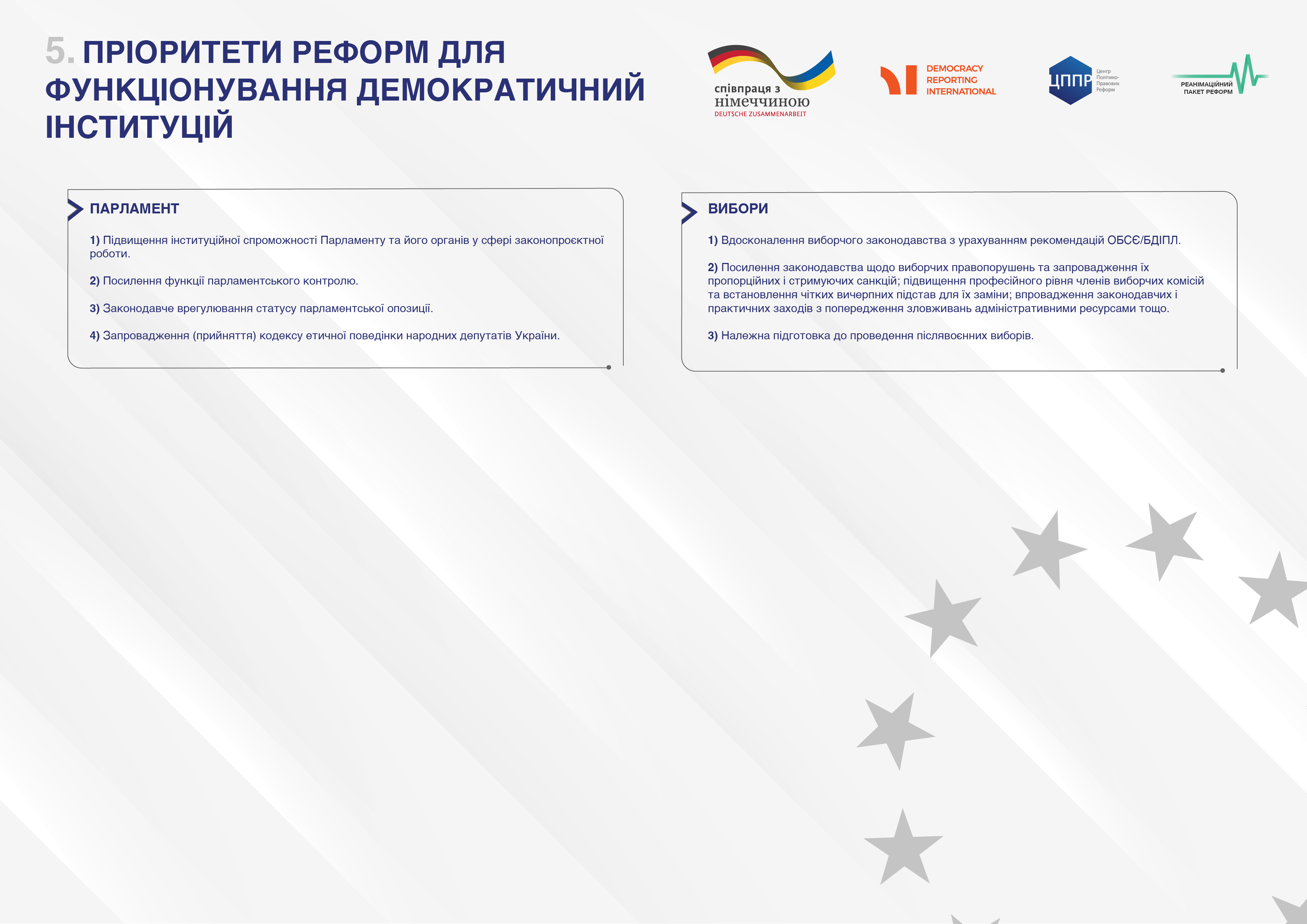 Захід організований Центром політико-правових реформ у партнерстві з Коаліцією Реанімаційний Пакет Реформ, Українським центром європейської політики та Democracy Reporting International (DRI) в межах реалізації проєкту «Демократична інтеграція, стійкість та залучення» (Ukraine-DARE), який реалізується за фінансової підтримки Федерального Міністерства закордонних справ Німеччини. Думки та погляди, висловлені під час заходу, не обов’язково відображають позицію Федерального Міністерства закордонних справ Німеччини.