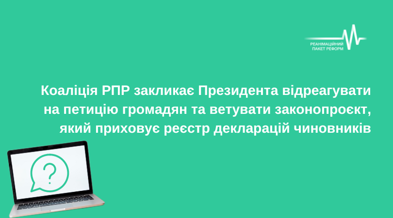 Реанімаційний Пакет Реформ > Новини > Заяви > Коаліція РПР закликає Президента відреагувати на петицію громадян та ветувати законопроєкт, який приховує реєстр декларацій чиновників