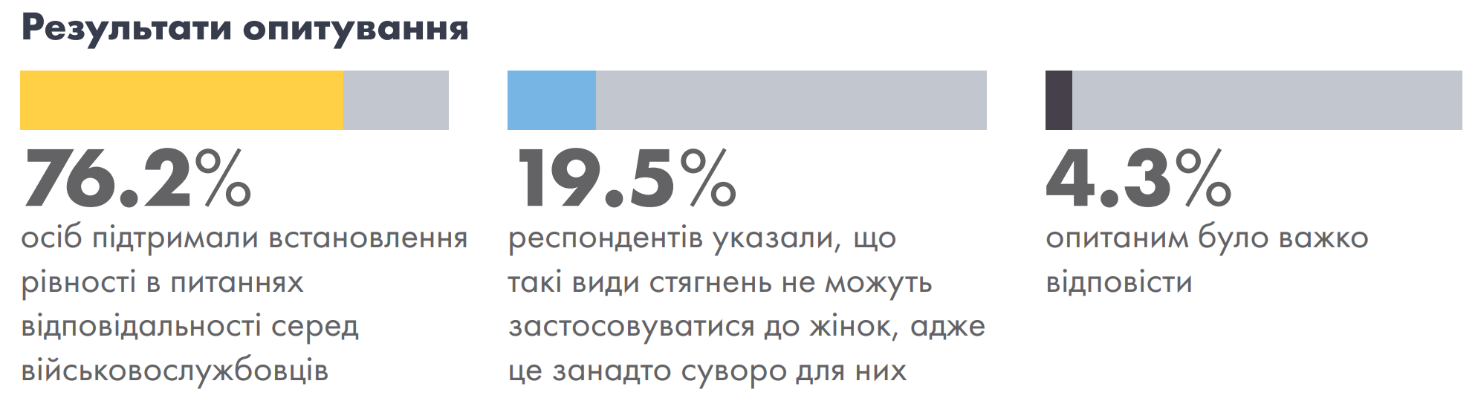 76.2% осіб підтримали встановлення рівності в питанні відповідальності серед військовослужбовців. 19.5% респондентів указали, що такі види стягнень не можуть застосовуватися до жінок, адже це занадто суворо для них. 4.3% опитаним було важко відповісти.