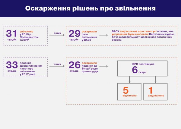 З 33 суддів, щодо яких є подання Дисциплінарних палат про звільнення у 2017 році 26 суддів оскаржили ці подання до Вищої ради правосуддя. ВРП розглянула 6 скарг, з яких: