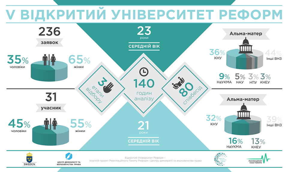 Сьогодні розпочався п’ятий Відкритий університет реформ – спільний освітній проект Реанімаційного Пакету Реформ і Центру демократії та верховенства права. Упродовж трьох місяців 31 учасник ВУРу відвідуватиме лекції та експертні дискусії, а також пройде стажування у провідних громадських організаціях – членах Реанімаційного Пакету Реформ. Проект реалізується за підтримки Уряду Швеції.