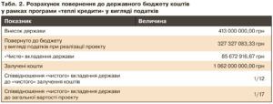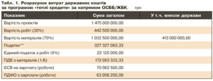 За підрахунками експертів, наведеними в табл. 1 та 2, можна побачити умовний приклад співвідношення державних коштів і коштів співвласників багатоквартирних будинків при реалізації енергоефективних заходів із залученням “теплих кредитів”, а також приблизний обсяг коштів, які повертаються до бюджету у вигляді податків.