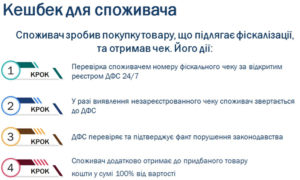 Експерти РПР запропонували модель “кешбек” для споживача”. Ідея в тому, що кожен покупець може перевірити виданий йому чек на спеціальному сайті. Якщо покупець виявить, що виданий чек не зареєстрований у ДФС, він зможе звернутися до податкової та отримати відшкодування — 100% вартості купленого товару.